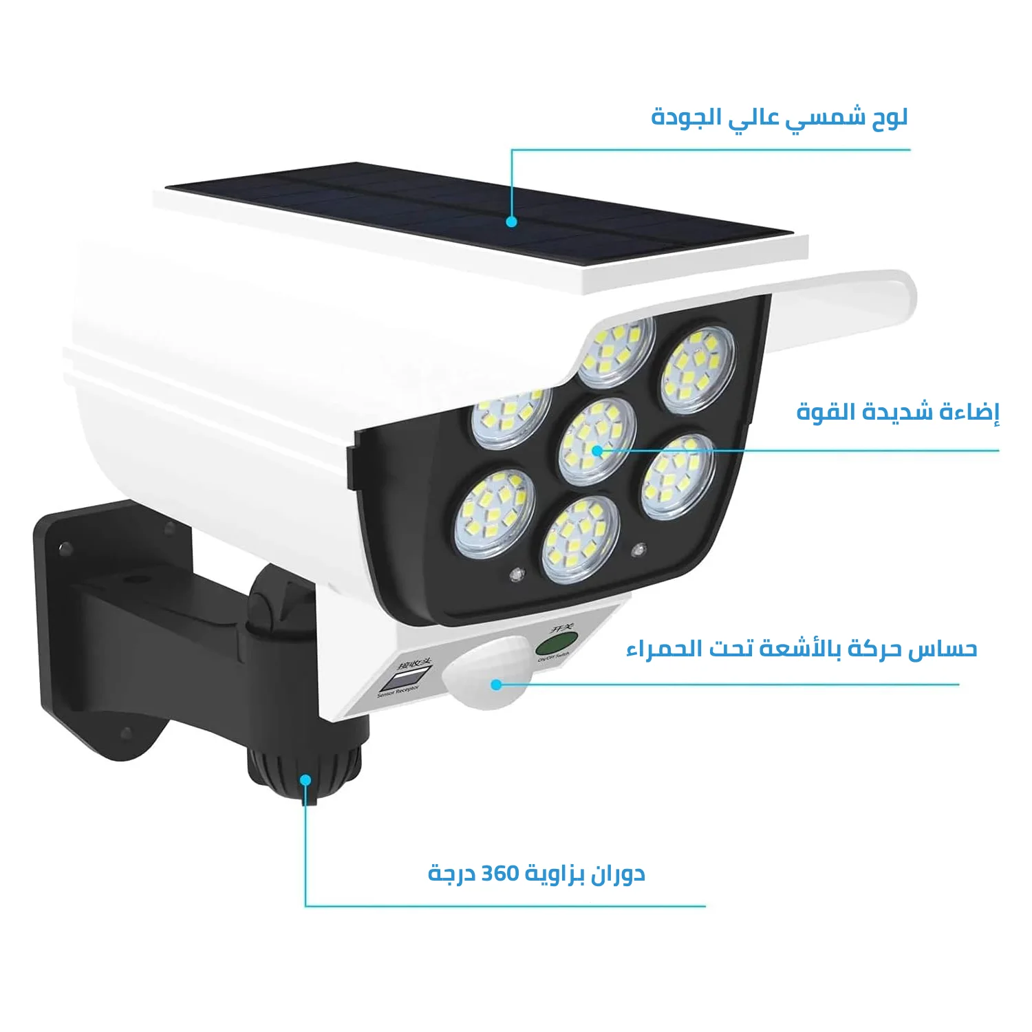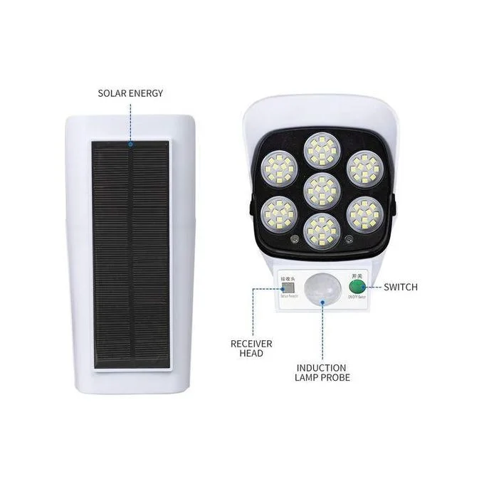 كاميرا وهمية (مش حقيقية)، تخدم بالطاقة الشمسية، فيها إضاءة LED قوية وحساس حركة، تعطي شكل نظام مراقبة احترافي بدون تكلفة الكاميرات الحقيقية.